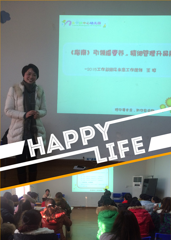 总结是对过去的回顾和分析,是对自己的客观评价,是对未来的思考。1月26日上午,王琼园长以“《指南》引领提素养,精细管理升品质”为主题,从“《指南》示范园的打造”、“园所文化的提升”、“幼儿园硬件设施的创设”、“教师师资力量的提高”、“园本课题的开展”等放方面入手,讲述了幼儿园在2015年下学期的工作中获得的成绩以及全体教师所取得的进步;以“三卓越”为目标、以“依法治教,创新实践”为主线、以推进幼儿园“学有良教”发展进程为重要任务,讲述了幼儿园未来的发展方向和目标,激励全园教职工不断锐意进取,为永幼的明天共同拼搏。