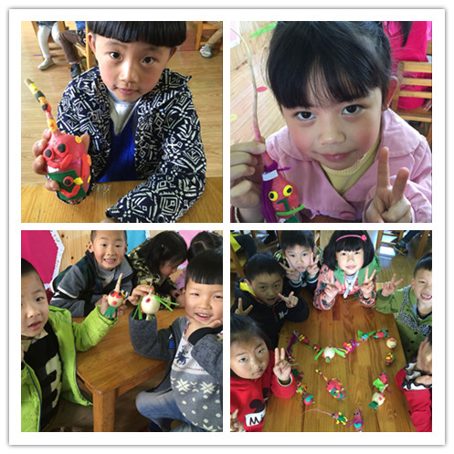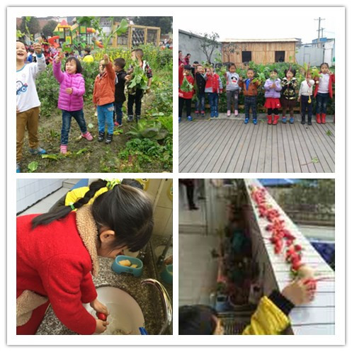 回到班上,小朋友将收获的果实清洗、晾晒,因为他们即将开始一次“小萝卜大变身”的手工创意活动。活动中老师们引导幼儿根据萝卜的主要特征进行广泛的联想、认真琢磨,积极地发挥想象力,用他们灵巧的小手做出了富有童趣的作品。“看,我用萝卜变的老爷爷”、“我用萝卜变德小猪”、“还有我和好朋友一起做的穿裙子的小姑娘勒”-----